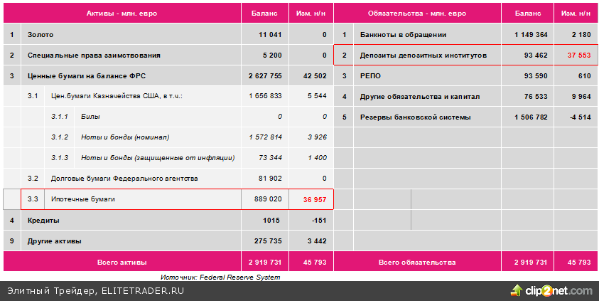 Покупка ценных бумаг на 1 мрлд. долл. увеличивает актив баланса ФРС на 1 млрд. долл. Чтобы оплатить эти бумаги, ФРС переводит деньги электронным переводом на депозитные счета дилеров по государственным облигациям. По данным на 15 ноября 2012 г., объем ценных бумаг на балансе ФРС в активе вырос за неделю на 42,5 млрд. долл., а депозиты депозитных институтов (в пассиве) увеличились на 37,6 млрд. долл