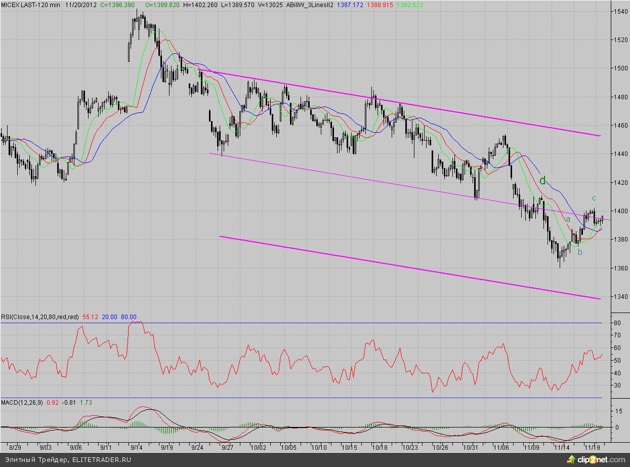 При этом чтобы реализовался «медвежий» сценарий, цены должны преодолеть минимум волны b (1375,1 п.). Ближайшей поддержкой выступит вчерашний минимум (1389,6 п.). Если же «быкам» удастся продолжить рост, начатый в прошлый четверг и преодолеть максимум «с» (1402,3 п.), то всё равно будем рассматривать данный подъём как коррекционный – в этом случае «бурым» надо будет держать уровень 62%-ной коррекции от последней волны падения (~1418 п.), чуть выше расположено и незакрытое окно от 8 ноября (~1420 п.).