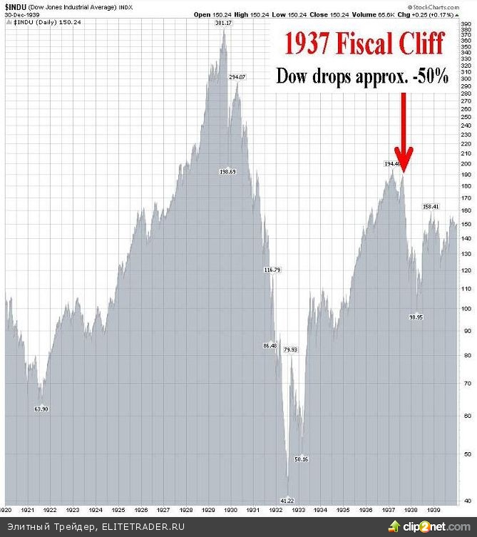 Дело в том, что республиканцы требуют сократить затраты, так как уверены, что это принесет оздоровление экономике. В качестве примера они указывают 1937 год, когда безработица в стране достигла 14.3%, и президент США Франклин Рузвельт начал «закручивать гайки», пытаясь сбалансировать бюджет. В конце 30-х годов индекс Dow Jones обвалился почти на 50%. Позиция республиканцев схожа с позицией Рузвельта, поэтому такие меры вполне могут привести к обвалу американского фондового рынка.