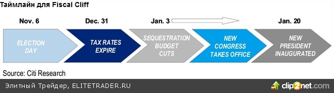 Уже 31 декабря истечет срок прежних налоговых ставок, затем 1 января сократятся расходы, а в январе будет утверждаться новый состав Конгресса и состоится инаугурация президента США, поэтому республиканцам и демократам в любом случае будет очень сложно достигнуть прогресса относительно Fiscal Cliff.