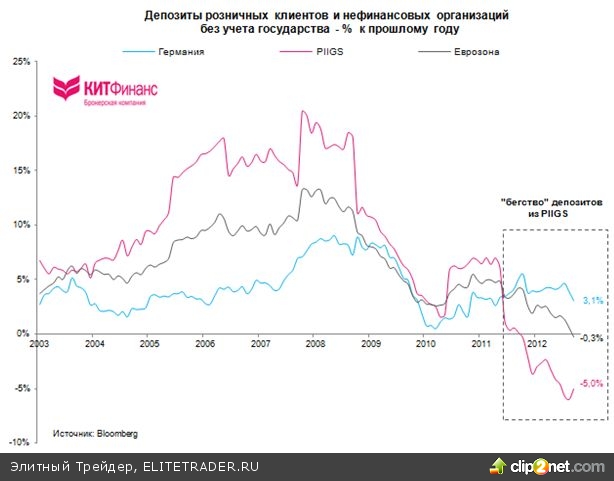 Падение уровня вкладов приводит к существенным перекосам в структуре балансов коммерческих банков европейской периферии – пассивы сужаются, и банки вынуждены избавляться от ликвидных активов (в т.ч. от государственных облигаций).