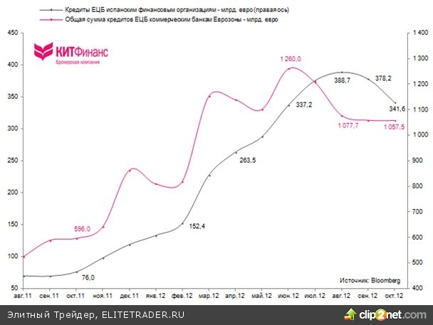 Объем кредитования испанских банков Европейским Центральным Банком в октябре 2012 г. сократился относительно сентября на 36,6 млрд. евро до 341,6 млрд. евро, что составляет около 1/3 от всех выданных ЕЦБ кредитов финансовым организациям Еврозоны в 1,05 трлн. евро.