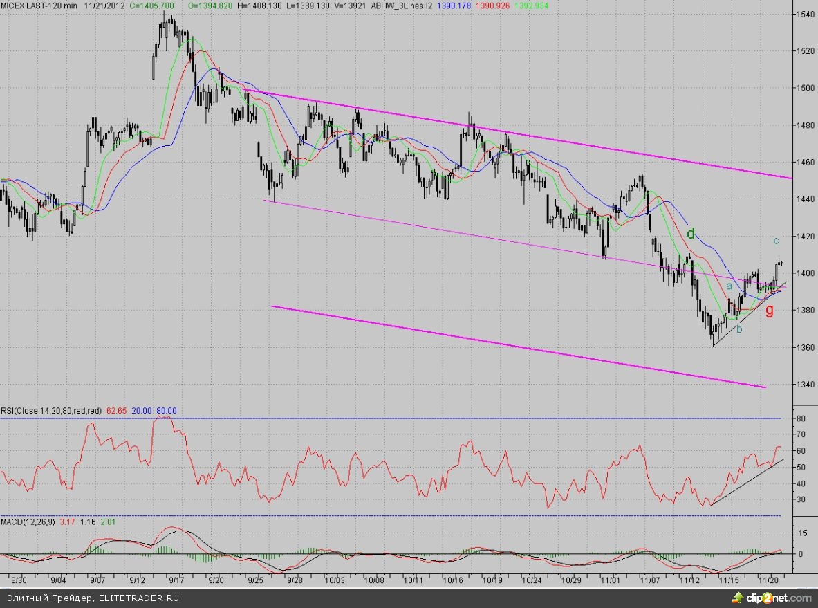 Исследуя 2-часовой график индекса ММВБ, видим, что с самого открытия и до обеда котировки находились в боковике и торговались невыразительно. Но после 3 часов дня рынок словно проснулся и «быки» пошли в уверенное наступление, и преодолели среднюю линию падающего канала и максимум вторника (1402,5 п.). Однако сильно развить свой успех покупателям не удалось, и цены застряли в районе предыдущего локального максимума d (1410,8 п.).