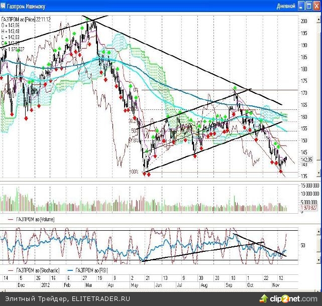 ГАЗПРОМ По итогам торгов четверга акции «Газпрома» потеряли в весе 0,48% и снизились до отметки 142,11 рублей. В течение дня котировки поднимались до уровня 143,48 рублей. Пока еще остается вероятность дальнейшего подъема акций до 144-145 рублей, до того района в котором я предлагаю открывать «короткие» позиции. В качестве «стопа» по данным позициям я предлагаю зону 146-146,5 рублей, на которую указывает медленная скользящая средняя ЕМА200 на часах и граница падающего канала, который идет от середины сентября. В целом, вчерашний день можно выкинуть из расчета и смотреть, на каком уровне закончат бумаги данную неделю. Если не будет попыток покинуть падающий тренд, то все-таки в этой акции уместнее продолжать играть от продаж