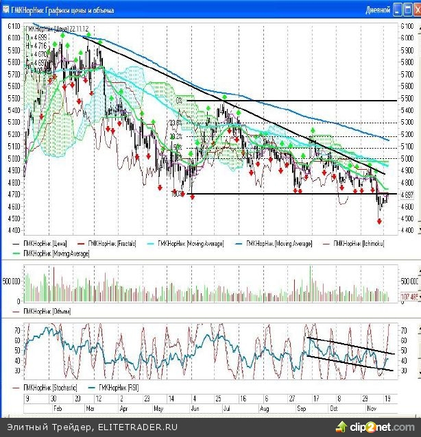 ГМК НорНикель Акции ГМК «Норильский Никель» вчера продолжили торговаться в районе ранее пробитой линии поддержки фигуры нисходящий «треугольник». Ранее я при подъеме акций в район 4680-4700 рублей в этих бумагах мы открыли «короткие» позиции, которые я предлагаю сохранять их и далее. «Стоп» по данным позициям советую располагать в районе 4750-4780 рублей и переносить только в случае ухода и закрепления цены за ближайшим дневным фракталом на продажу, который образовался на минимуме 14 числа. Ближайшей целью снижения является установление нового ценового минимума в этих акциях.