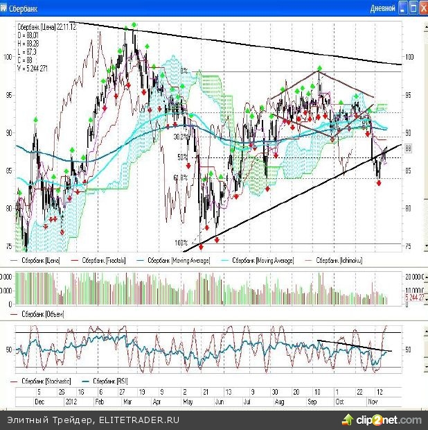 СБЕРБАНК Вчера обыкновенные акции «Сбербанка» продолжили укрепляться и «быкам» удалось обновить максимум среды, забросив котировок до отметки 88,28 рублей. Открытые ранее «короткие» позиции в зоне 86,5-87 рублей я пока продолжаю удерживать, ведь «стоп» я решила расположить в зоне 88,5-88,6 рублей и он пока устоял. Если котировки прорвутся выше, то смогут подняться до следующего важного рубежа, расположенного на уровне 89,45 рублей. А там уже будет стоять вопрос о возврате в рамки растущего тренда, хотя на мой взгляд, предыдущий выход вниз вряд ли можно считать ложным выходом. А это означает, что цены все равно скорректируются