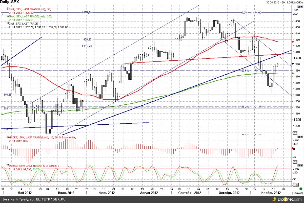 Позитивная статистика по рынку жилья и сильные отчеты корпораций поддержали набирающий силу рост. Продажи вторичного жилья в октябре выросли на 2,1% до 4,79 млн. с пересмотренных сентябрьских 4,69 млн. По сравнению с уровнями октября 2011 года рост составил 10,9%. Аналитики опрошенные Рейтер ожидали нулевой динамики относительно ранее обозначенного сентябрьского показателя на уровне 4,75 млн., по данным Bloomberg консенсус и вовсе предполагал снижение показателя до 4,74 млн. Согласно данным Markit индекс делового доверия в обрабатывающей промышленности США за ноябрь, обнародованная Markit показала рост PMI с трехлетнего минимума на уровне 51 пункта до 52,4 пункта, превысив ожидания аналитиков. Темпы роста были максимальными за последние 5 месяцев. Недельные данные по первичным обращениям за пособиями по безработице вновь показали превышение уровня в 400 тыс., что является последствием урагана Сэнди.