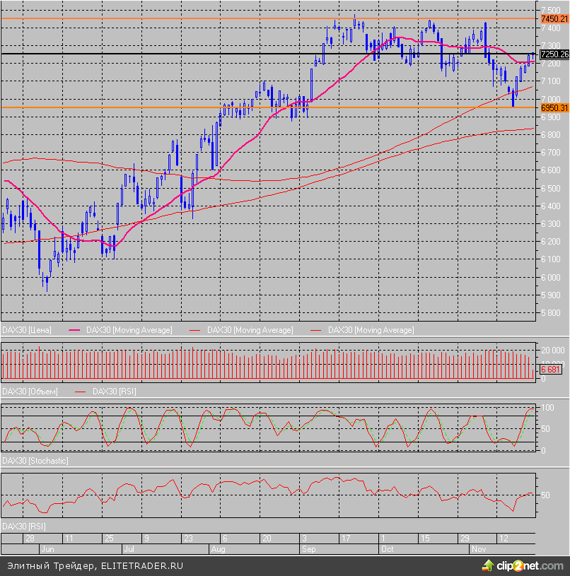 Котировки немецкого индекса DAX открылись вверх, пробив уровень 7200 пунктов и колебались в первой половине дня в коридоре 7220-7260 пунктов. Учитывая, что американские торги сегодня будут вялыми из-за «черной пятницы», можно ожидать, что европейцы не будут проявлять большой активности и оставят индексы в боковике.