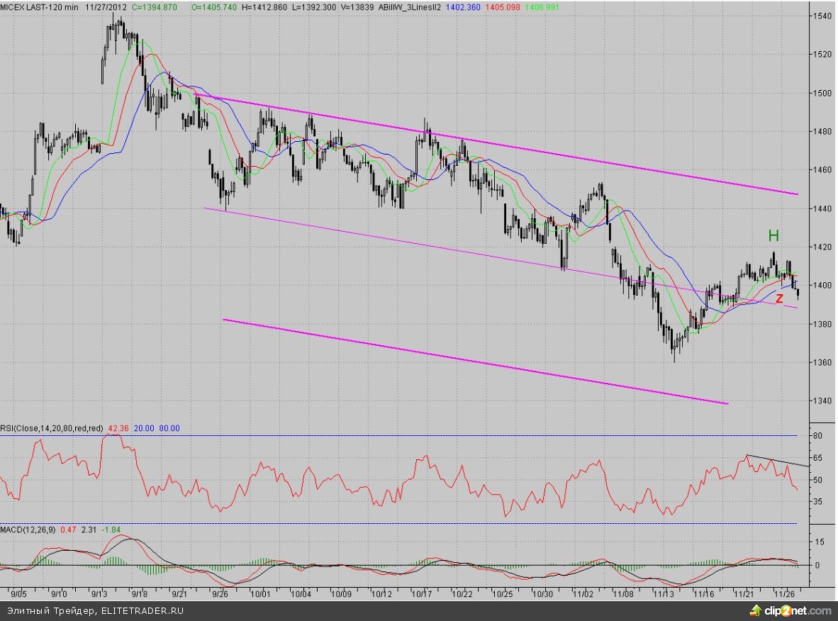 Исследуя 2-часовой график индекса ММВБ, видим, что открывшись с небольшим гэпом вверх, котировки попытались продолжить это движение. Однако оптимизма хватило ненадолго, и цены так и не дошли до максимума предыдущего дня. А с полудня «медведи» возобновили контратаку понедельника и уже до конца дня не выпускали инициативу. В результате цены уверенно преодолели ближайшую поддержку в лице минимума 26.11, который к тому времени стал новым 2-часовым фракталом на продажу Z (1399,6 п.). И только окончание торгов спасло «быков» от дальнейшего отступления, поскольку после нашего закрытия мировые рынки пошли ниже.