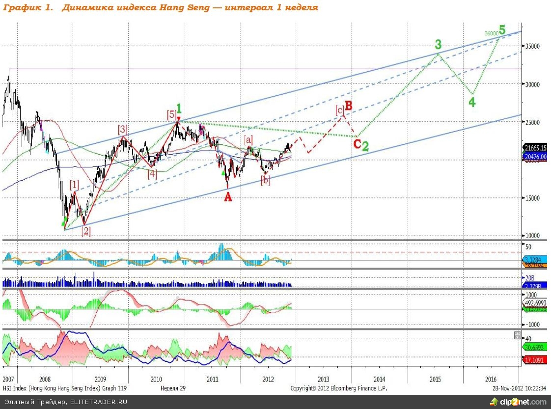 В течение четырех последних лет индекс Hang Seng находится в рамках восходящего канала, который обозначен на графике 1 светло-синими сплошными линиями. В 2009 – 2010 годах была сформирована фаза роста — волна 1. После чего последовала затяжная плоская коррекция A-B-C, которая продолжается и в настоящее время. Сейчас формируется подволна [c] в волне B, целью которой видим уровень 25700 пунктов (18,62%). Конечным ориентиром повышения в рамках масштабного пятиволнового импульса 1–5, по нашему мнению, является уровень 36000 пунктов (+66,15%).