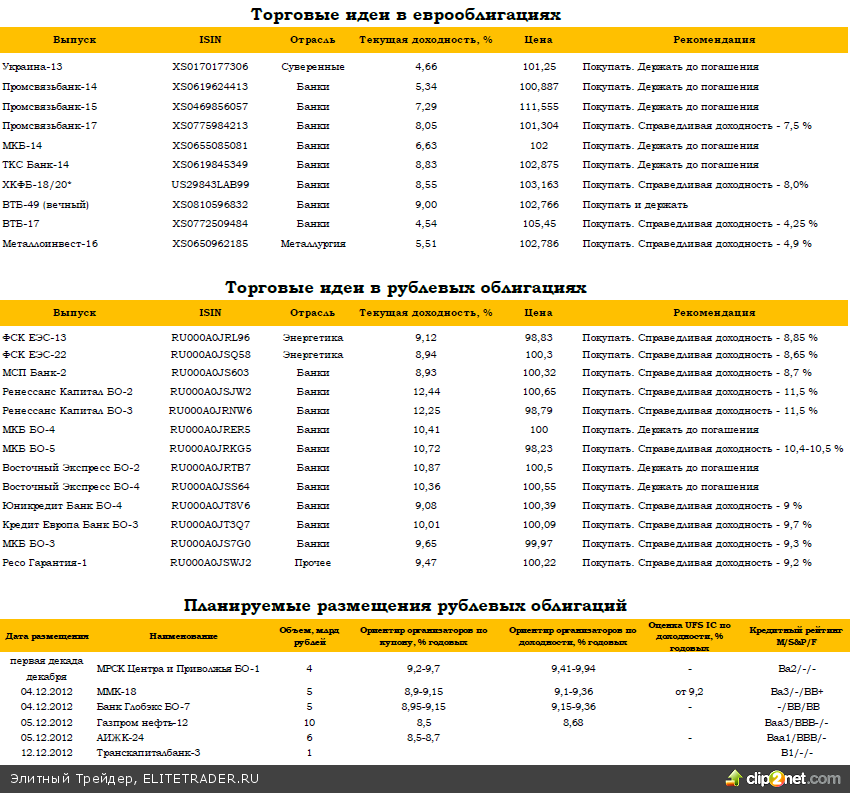 Однако, в корпоративном секторе в некоторых бумагах продолжили отыгрываться отдельные торговые идеи. Так, выпуск АльянсОйл-15, который мы рекомендовали к покупке в нашем специальном комментарии к отчетности эмитента за 9 месяцев, взлетел вчера на 0,9%. Котировки бумаги отреагировали на новость о том, что эмитент планирует привлечь около $100,0 млн. за счет продажи «префов» и использовать их на покупку лицензий.
