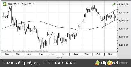 После того как в ноябре ожидания в отношении будущей инфляции в Америке понизились, золото стало торговаться как обычный рисковый актив, ориентируясь на фондовый рынок и курс доллара. Учитывая, что доверие на фондовом и валютном рынках было подорвано отсутствием прогресса в решении проблемы «фискального обрыва», пессимистичные заявления властей заставили золото обратиться в бегство в условиях распродажи акций и покупок доллара. Впоследствии в этот же день появились более обнадеживающие комментарии, и движение развернулось. Золото немного восстановило потери, лишний раз подтвердив наличие прочной поддержки в районе уровня 1705 долларов.