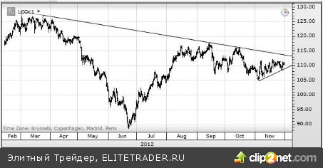 На протяжении последнего квартала нефть марки Brent торговалась в относительно узком диапазоне в районе 110 долларов за баррель. Учитывая, что места для маневров становится меньше с каждым днем, мы ожидаем прорыва на первой неделе декабря. Сначала нефть устремится вверх, поскольку трейдеры, которые уже владеют длинными спекулятивными позициями, попытаются продолжить такое движение для поддержания общей картины, что характерно для рынка в конце года. Однако, на наш взгляд, эта попытка пробить сопротивление, проходящее по линии тренда чуть ниже 114 долларов, не удастся, потому что на данном этапе для этого нет фундаментальных факторов. В конечном итоге, нефть сорта Brent вернется в диапазон между 105 и 112 долларами.