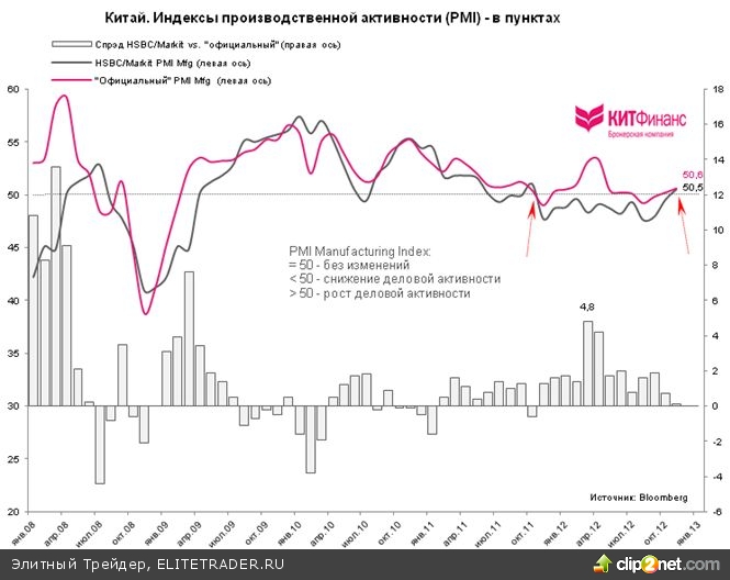 Кроме этого, ноябрьская финальная оценка индекса производственной активности в малом и среднем бизнесе Китая (выборка по 400 компаниям) от HSBC/Markit - 50,5 пункта против 49,5 пункта в октябре - также подтвердила наличие позитивных тенденций в промышленности второй экономики мира. Индекс поднялся до уровня 13-ти месячных максимумов, закрепившись выше 50 пунктов. До ноября 2012 г. двенадцать месяцев подряд, или пятнадцать месяцев из последних семнадцати, индикатор деловых настроений малого и среднего бизнеса Китая находится ниже 50 пунктов, отделяющих рост от сокращения.