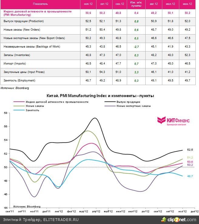 Согласно опубликованным 1 декабря данным Национального бюро статистики и Федерации логистики и закупок Китая на основе опроса крупнейших 820 компаний из 31 отрасли экономики, индекс деловой активности в промышленности - PMI Manufacturing Index - в ноябре 2012 г. достиг уровня в 50,6 пункта благодаря росту новых заказов и экспорта, что стало максимальным значением за последние 7 месяцев.