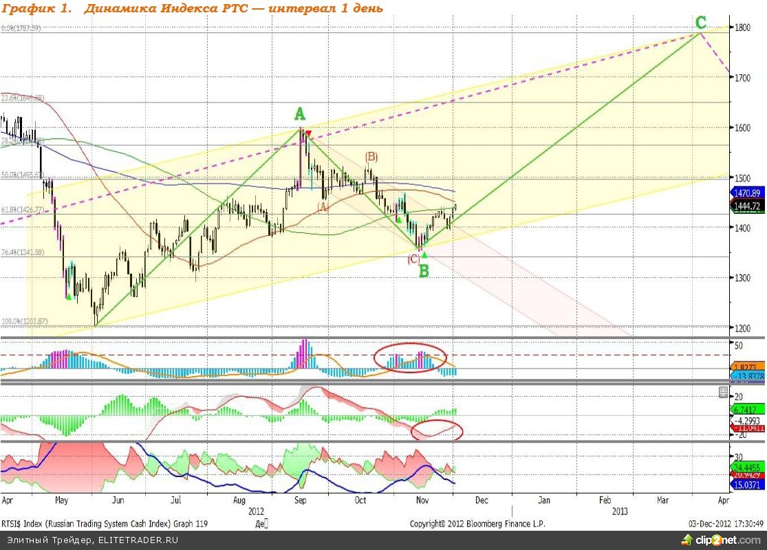 Из вышесказанного можно сделать вывод, Индекс РТС начал формирование фазы роста. Если предположить, что волна C будет соразмерна волне A, что наиболее часто бывает в зигзагообразных движениях, то ориентиром роста в рамках волны C является уровень 1750 пунктов (+21,1%).