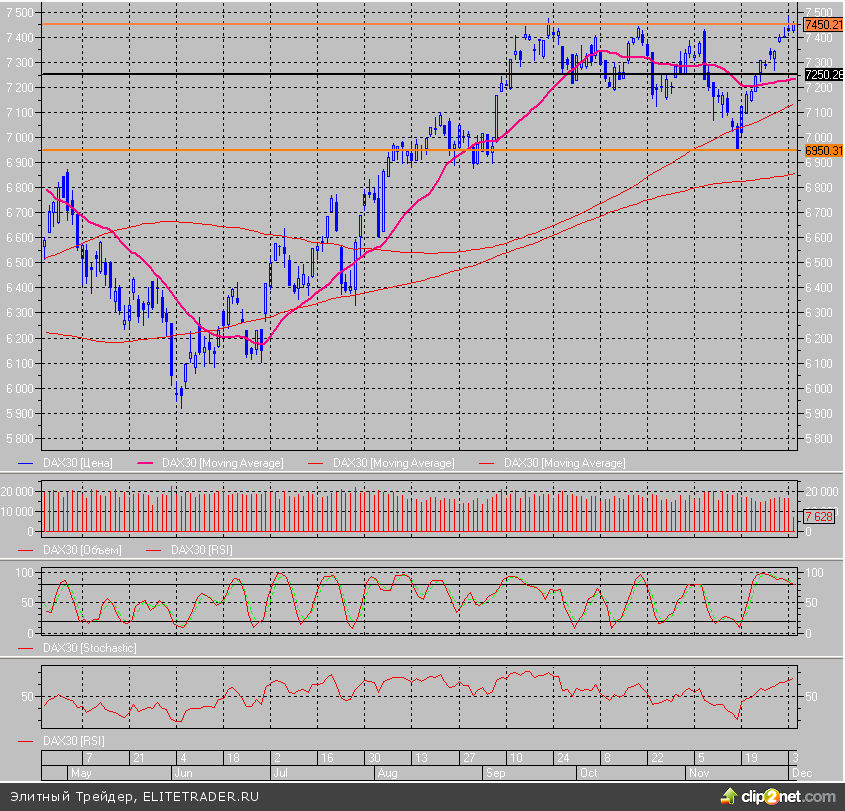 Немецкий индекс DAX постепенно растет в течение дня и с уровня 7440 он смог вырасти до 7465 пунктов, после чего консолидируется в диапазоне 7450-7460.