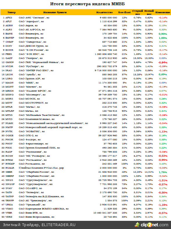 Значительные изменения коснутся и «голубых фишек». Фактически с 18 числа изменится не только список бумаг для расчета индекса, но и веса бумаг, которые в него уже входят на основании изменения free-float и оборотов торгов.