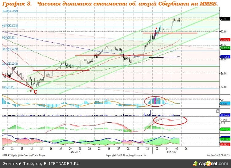 Акции Сбербанка находятся в рамках восходящего канала, который отображен на графике 3 зеленым цветом. MACD сформировал сигнал к продаже. ADX говорит о том, что в восходящий тренд в развитии, DMI+ находится выше DMI-, ADX в верхней части шкалы. Индикатор, основанный на динамике ADX, 3 декабря дал сигнал к продаже, что стала результатом сильного роста стоимости акций банка 30 ноября. Поддержка на уровне 91,50 рубля. Сопротивление – 94,00. Рекомендация: Держать