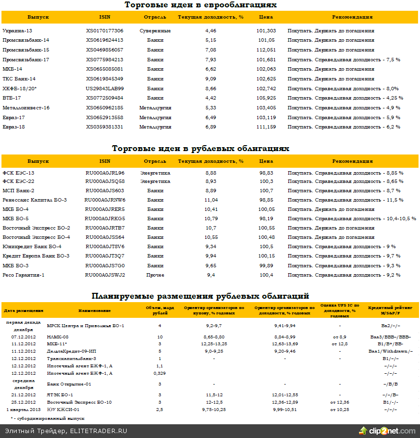 МКБ (В1/В+/ВВ-) 11 декабря планирует разместить субординированные облигации 11-й серии сроком обращения 5,5 лет объемом 3 млрд рублей. Книга заявок на покупку бумаг была открыта 3 декабря, закрытие книги запланировано на сегодня. Ориентир по ставке 1-го купона находится в диапазоне 12,25–13,25% годовых, доходность — 12,63– 13,69% годовых. Бумаги будут размещаться по закрытой подписке среди юридических лиц. Премия по новому выпуску МКБ к собственной кривой составляет от 100 до 210 б.п. Для сравнения, единственный на рублевом долговом рынке субординированный выпуск Промсвязьбанка, размещенный в августе текущего года, торгуется с премией к своей кривой порядка 240 б.п. Спред между кривыми доходностей МКБ и Промсвязьбанка составляет от 80 до 120 б.п в зависимости от дюрации займа. Ориентиры по субординированному займу МКБ предполагают премию к субординированному займу Промсвязьбанка до 1 п.п. по верхней границе. Мы полагаем, что участие в размещении выпуска МКБ представляет интерес с доходностью, начиная от 12,8% годовых.