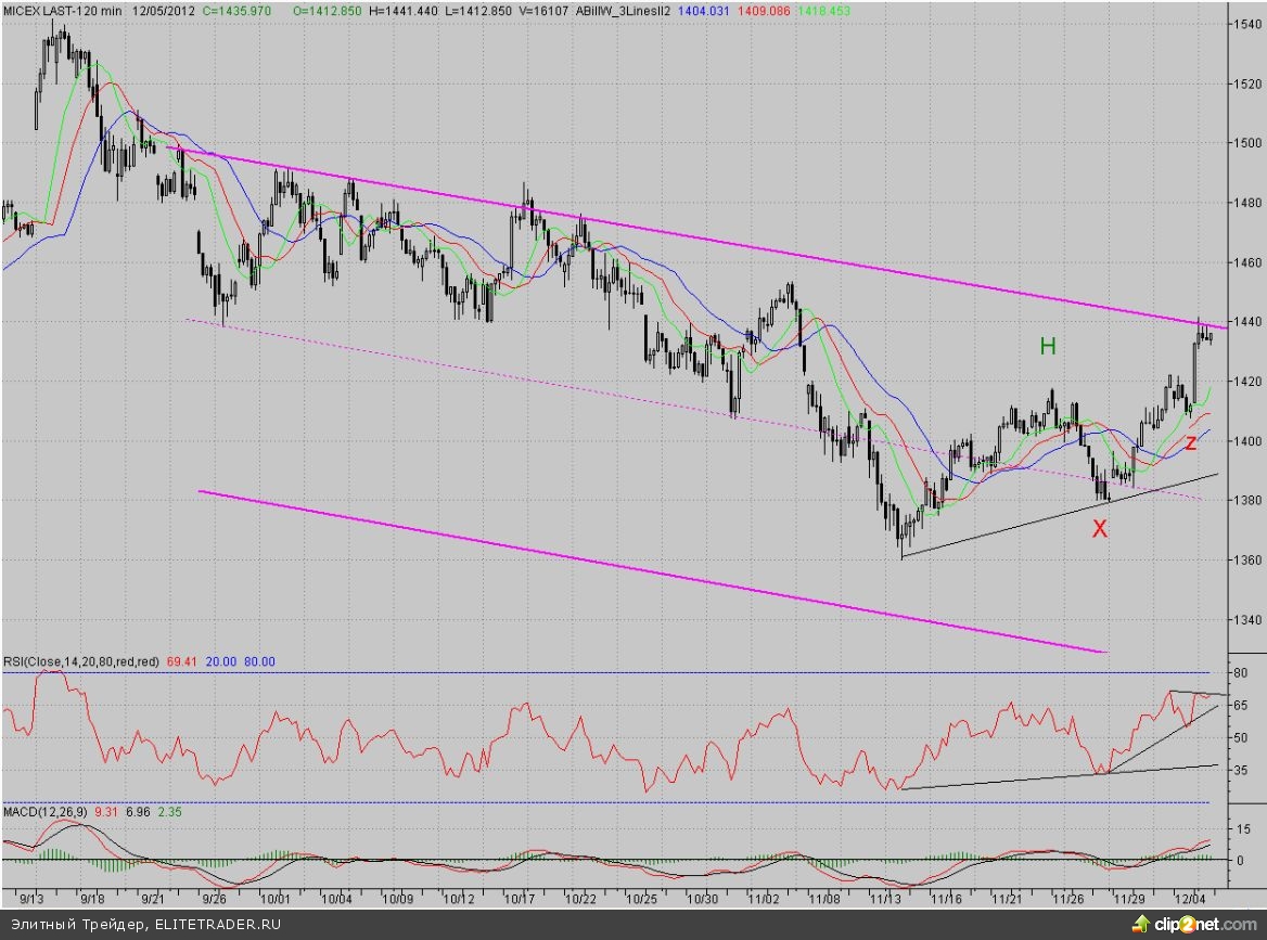 Исследуя 2-часовой график индекса ММВБ, видим, что на позитивном внешнем фоне котировки открылись с гэпом вверх и уверенно продолжили рост, начатый ещё на прошлой неделе. На какое-то время ближайшее сопротивление в лице максимума понедельника (1422,2 п.) приостановило «быков», но оптимизма в их глазах было так много, что данный уровень был быстро покорён. После этого поход на Север продолжился, и только район верхней границы среднесрочного падающего канала сумел остановить «бычье» наступление, хотя в моменте он и прокалывался. У данного рубежа котировки проторговались всю оставшуюся сессию. В результате день закрылся почти на максимуме.