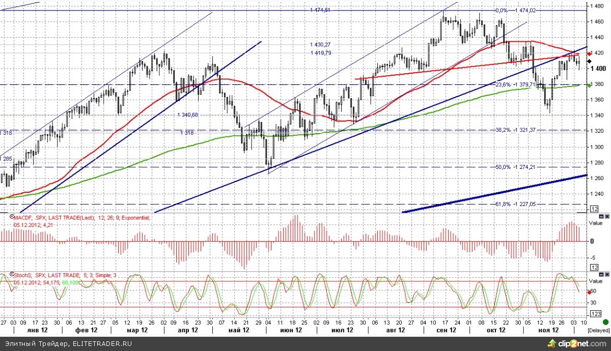 В данный момент фьючерсный контракт на SP500 торгуется с понижением на 0,25% около отметки 1405п.