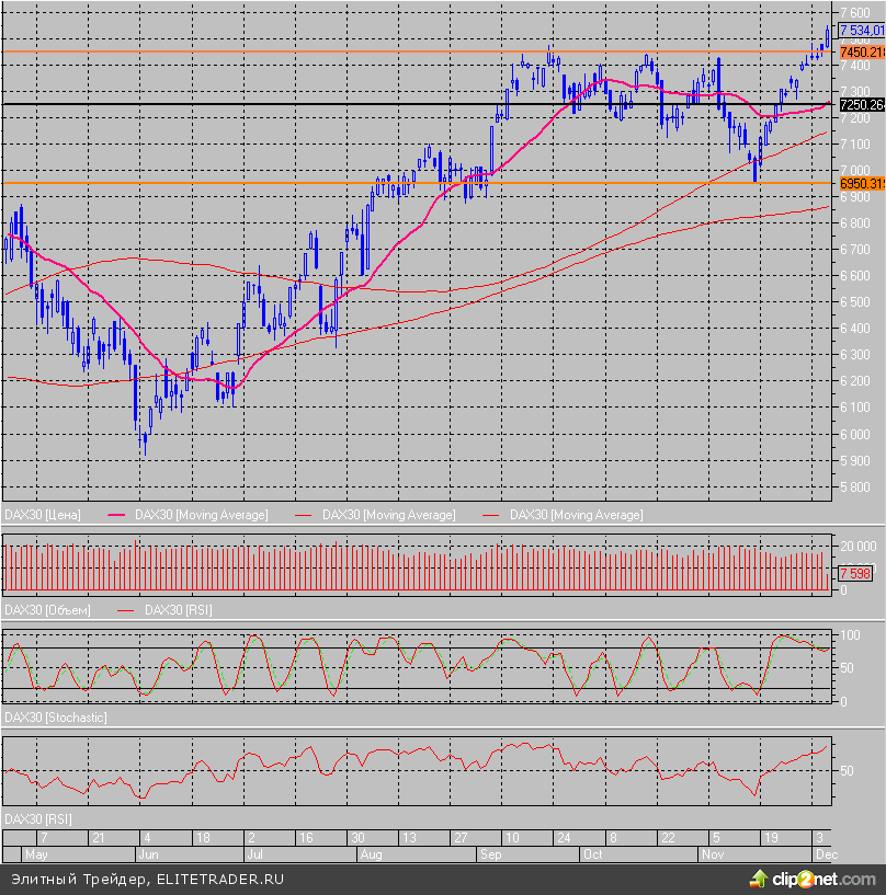 Индекс DAX мощно устремился вверх в первой половине дня и с 7450 пунктов вырос до 7550 пунктов, однако не смог удержать эту позицию. Сейчас индикатор пытается закрепиться выше 7520, однако все будет зависеть от итогов заседаний европейских центробанков.
