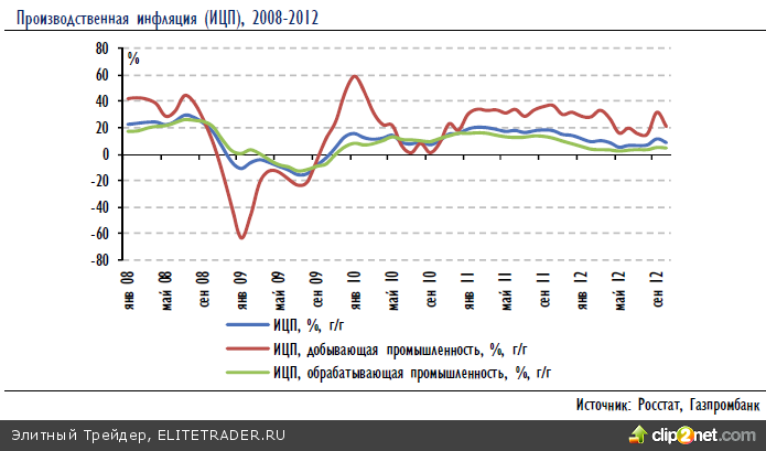 Продовольственная инфляция не будет вызывать особого беспокойства до марта 2013 г., далее возможен кратковременный сезонный всплеск за счет истощения сезонных запасов зерна и роста мировых цен на пшеницу. Но во 2П13 можно ожидать снижения цен на продукты питания, в связи с тем, что сельскохозяйственный урожай-2013 ожидается на 20,0-30,0% лучше, чем в 2012 г.