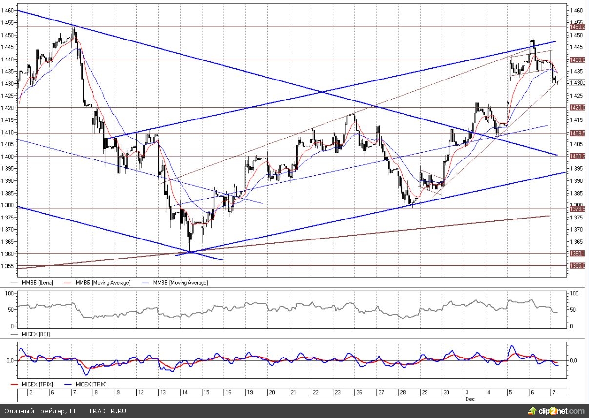 После того локального прокола линии сопротивления последовал откат назад. На графике индекса была сформирована локальная «голова-плечи». Потенциал этой формации - возврат к предыдущему локальному максимуму в диапазон 1420-1425, установленному в самом начале декабря. На снижении ММВБ добрался до линии поддержки восходящего тренда с конца ноября на 1430.