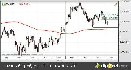 В пятницу рынок драгоценных металлов испытал дополнительное давление со стороны отчета о занятости в США за ноябрь, который оказался более благоприятным, чем ожидалось, так как уровень безработицы продолжил падать. Это был последний отчет о занятости в этом году, а значит, и последний индикатор состояния экономики перед финальным заседанием Комитета по операциям на открытом рынке ФРС в 2012 году, которое состоится 12 декабря. В связи с этим увеличились разговоры о том, что на этом заседании, возможно, будет объявлено о продлении мер по количественному смягчению. Прежде всего, участники рынка указывают на истечение срока программы твист-операции, в рамках которой ФРС продавал краткосрочные облигации для покупки облигаций с более длительным сроком погашения. Возможно, что это программа будет полностью или частично заменена на традиционную программу выкупа облигаций. В этом случае существенно увеличатся масштабы программы печатания денег, которая действует с того самого момента, как в сентябре этого года было объявлено о третьем раунде количественного смягчения. Если это действительно произойдет, то это обеспечит необходимый спрос на золото и серебро, а также укрепит игроков во мнении, что у золота по-прежнему есть хороший потенциал для роста. Из-за возросшей неопределенности и снизившейся ликвидности ближайшая пара недель может оказаться нелегким испытанием в плане торговли. Основная поддержка сосредоточена в промежутке между уровнями 1672 и 1661, которые представляют собой недавний минимум и 200-дневную скользящую среднюю. Сопротивление находится в районе двух уровней Фибоначчи – 1711 и 1728.