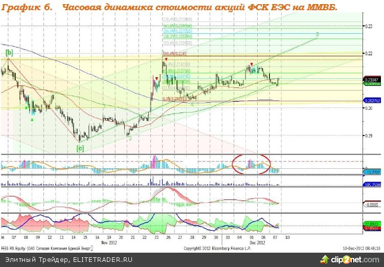 Акции ФСК ЕЭС (интервал – 1 час) – в рамках восходящего тренда. MACD – нейтрально. ADX указывает на отсутствие тренда, DMI+ и DMI- сошлись, ADX в средней части шкалы и направлен вниз. Индикатор, основанный на динамике ADX, 5 декабря дал сигнал к продаже. После роста, который наблюдался во второй половине ноября, котировки акций компании консолидируются, что говорит о возможности дальнейшего продолжения восходящего движения. Поддержка – 0,198. Сопротивление – 0,219. Рекомендация: Держать.