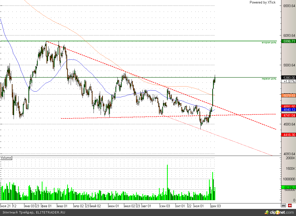 Между тем Владимир Потанин может быть утвержден на посту ген директора ГМК Норникеля уже 17 декабря, ведь именно в этот день совет директоров компании обсудит данный вопрос. Котировки Норникеля растут сегодня на 1,1 % и уже достигли первой цели роста после выхода из сужающегося треугольника.