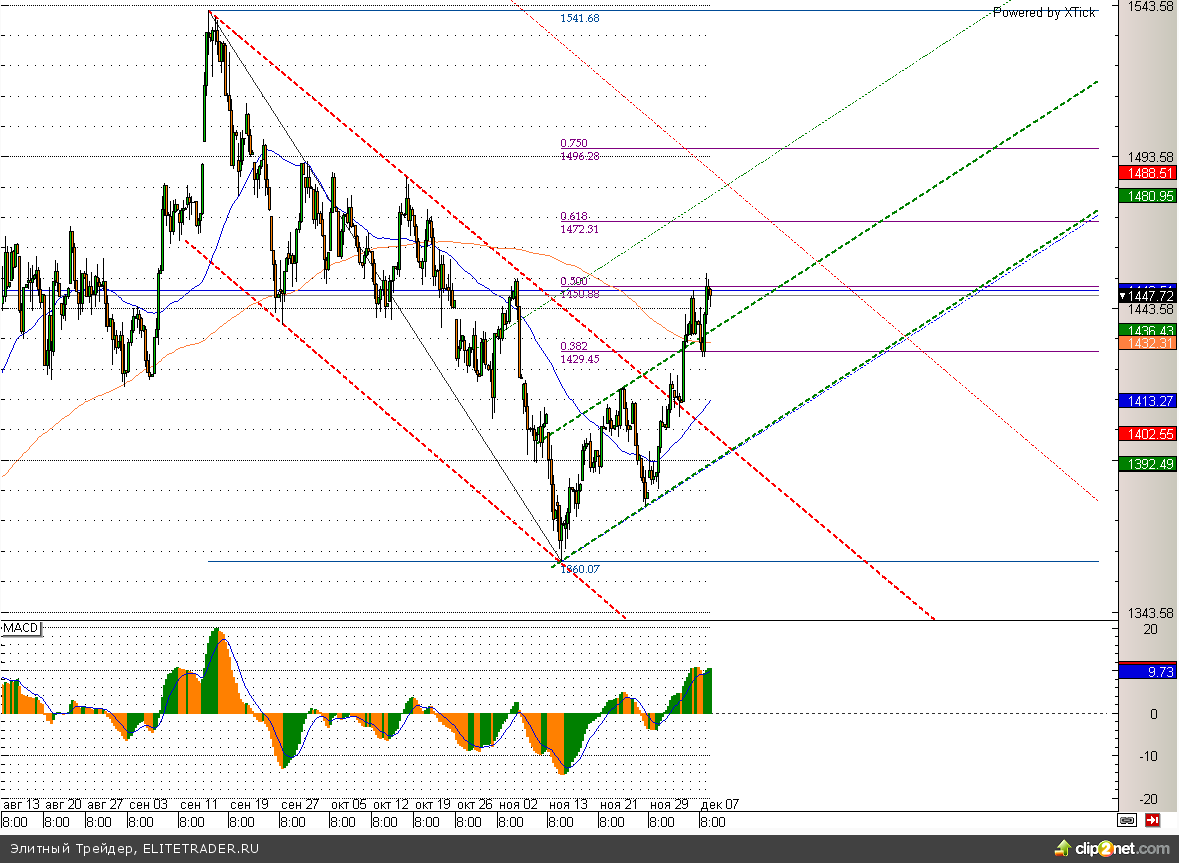 Индекс ММВБ пока не смог закрепиться выше 1450, но судя по агрессивному настрою покупателей, уже завтра мы можем стать свидетелями новой атаки на этот уровень. Рост по российскому рынку составил 0,43%, даже, несмотря на то, что европейские индексы, как и фьючерс на S&P500, торгуются вблизи цен закрытия пятницы.