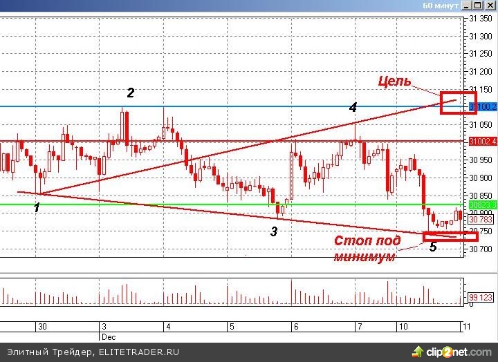Идея связана с тем, что последние дни фьючерс SiZ2 обновляет минимумы дня, но развития движение вниз не получает. Так, сегодня с утра вчерашний минимум 30 739 пунктов был обновлен до 30 735 пунктов. Торговая идея связан с бычьей волной Вульфа, которая отображена на рисунке 1.