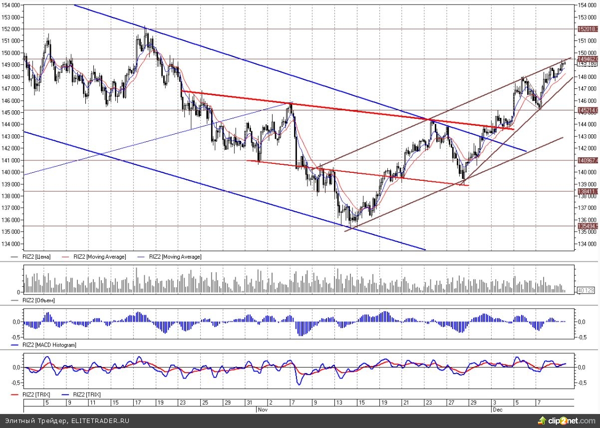 Также RIZ2 декабрьским ростом продолжает реализацию сформированной ранее перевернутой фигуры «голова-плечи». Технический потенциал формации вплоть до максимальных уровней конца сентября - начала октября на 152000-153000. Но надо помнить, что в начале следующей недели грядет экспирация фьючерсов.