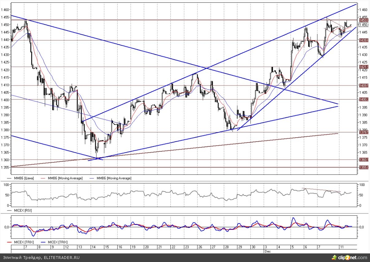 Сегодня будут новые попытки продолжить подъем и пробить сопротивления на 1453-1455. В то же время сейчас индекс взбирается вверх восходящим клином. Его нижняя граница находится на 1450, линия сопротивления в районе 1465, как раз к ней и может направиться индекс при пробитии уровней 1453-1455. Также после пробития максимумов на 1453 по рынку может пройти серьезное ускорение вверх. В то же время не стоит забывать, что восходящий клин обычно по технике пробивается вниз, и после еще одной волны роста может пройти боле существенная коррекция с пробитием восходящего тренда с конца ноября.