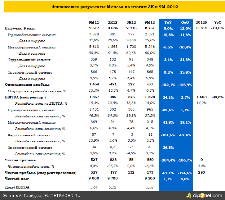 Чистая прибыль вышла из минуса, даже с учетом разовых статей (убытки по курсовым разницам). По итогам 9М12 показатель пока получается отрицательным из-за крупных списаний в 2К12 – в счет готовящейся продажи активов. Мечел планирует завершить основной этап реструктуризации группы в 1П13. Однако пока сложно сказать, какие именно активы будут проданы уже в текущем году – поэтому чистая прибыль по итогам года – под большим вопросом. Рынок уже смирился с тем, что она будет отрицательной из-за разовых статей, но возможны варианты – если ряд крупных сделок пройдет уже в этом году. Мы ожидаем, что без учета разовых статей прибыль по итогам года составит $280 млн. Номинальная прибыль при этом может варьироваться в достаточно широких пределах.