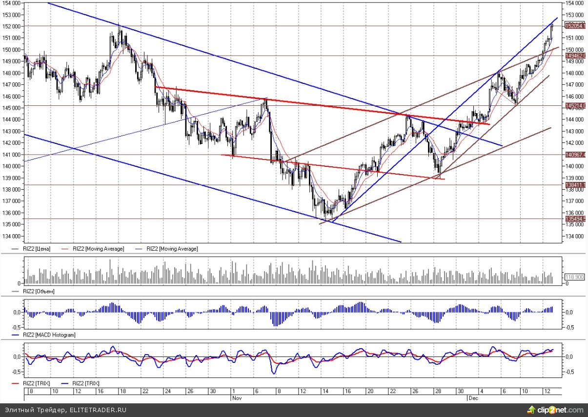 Фьючерс на индекс РТС продолжил поступательное движение наверх, поднимаясь все выше. После пробития линии сопротивления месячного восходящего канала с середины ноября RIZ2 подъем ускорился, и фьючерс добрался до ближайших сопротивлений на 152000-152500.