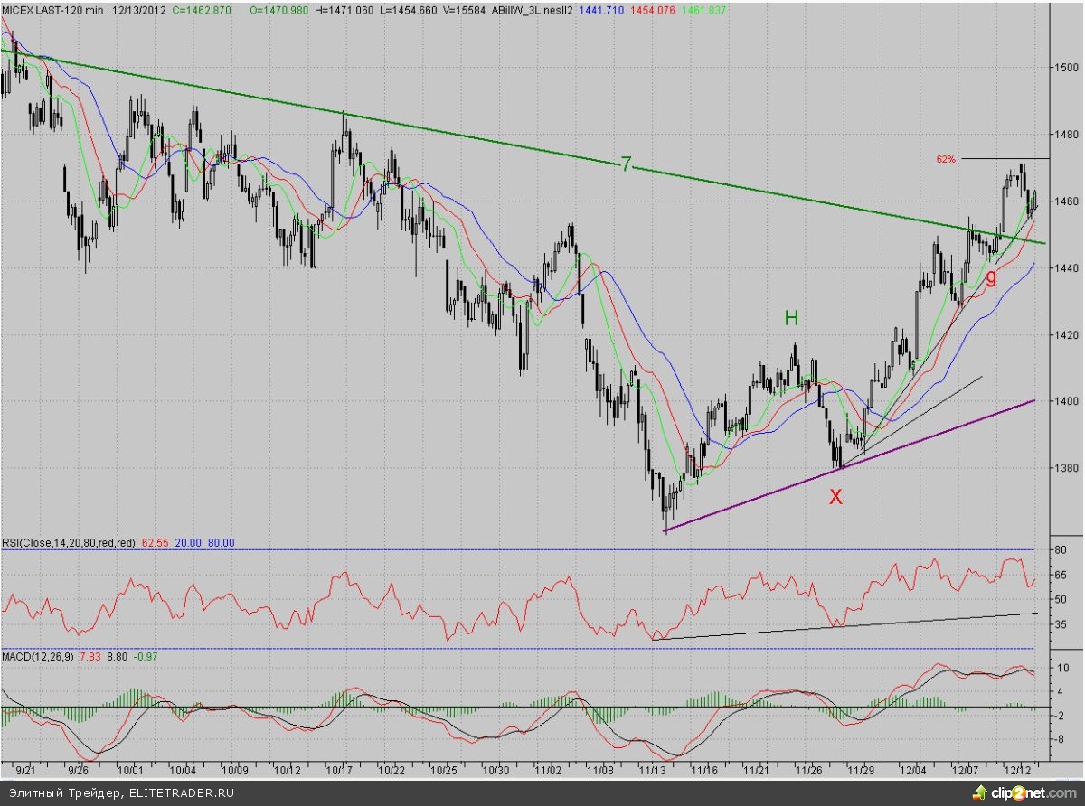 Исследуя 2-часовой график индекса ММВБ, видим, что открывшись с небольшим гэпом вверх, котировки сразу оказались в районе сопротивления в лице уровня 62%-ной коррекции от падения с середины сентября (~1473 п.). На данном рубеже их поджидали «мишки», жаждущие реванша за отданный днём ранее Рубикон в лице долгосрочного падающего тренда (7). Правда, первая их контратака не увенчалась успехом, и цены вернулись на утренний максимум. Но ближе к обеду «медведи» всё же набрались сил и продавили котировки ниже. Однако и на этот раз раздачи не получилось, и цены остановились на краткосрочном растущем тренде. В итоге закрытие произошло лишь в небольшом минусе.