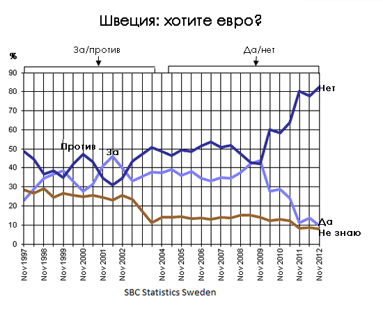 Исторически сложилось, что противников евро по итогам голосований всегда было больше. С 1997 года - когда подобные опросы только начали проводиться - было лишь три периода, когда сторонники евро обошли скептиков: в 1999 году, с мая 2001 года по ноябрь 2002 года, а затем - в 2009 году во время финансового кризиса, когда у шведской экономики случился обморок. Возможно, они думали, что сила в количестве.