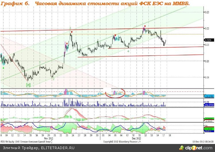 Акции ФСК ЕЭС (интервал – 1 час) – котировки акций компании вышли за пределы восходящего тренда. Однако, полагаем, ФСК сохраняет большую вероятность роста. MACD – сигнал вниз. ADX указывает на развитие слабого нисходящего тренда, DMI+ чуть ниже DMI-, ADX в средней части шкалы и направлен вверх. Индикатор, основанный на динамике ADX, с 23 ноября по 12 декабря дал сигнал множество сигналов к продаже. Котировки акций компании движутся к поддержке на уровне 0,2079. Сопротивление – 0,22. Рекомендация: Держать.