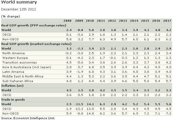 Политическая напряженность сильно давила на глобальную экономику в этом году. Вражда между правительствами еврозоны по поводу решения долгового бремени слабых экономик толкнула валюту к опасным уровням в средине года. Если вновь избранный президент и законодатели не смогут прийти к соглашению по налогам и расходам, страна столкнется с фискальной заморозкой более чем 600 миллиардов долларов в 2013 году, что будет достаточно для того, чтобы толкнуть американскую экономику обратно в рецессию и подавить рост большей части остального мира.
