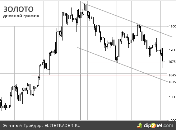 Если в ближайшие дни цены все же закрепятся ниже отметки $1675 за унцию, то можно будет констатировать факт продолжения нисходящего 3-х месячного тренда. Ключевыми зонами поддержки являются цены $1635-1645/тр.унц.