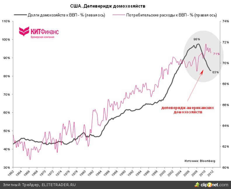 *Последствия делевериджа американских домохозяйств сложно переоценить, так как потребительские расходы составляют 71% ВПП. Процесс снижения долговой нагрузки продолжается до сих пор. Однако нетрадиционная монетарная политика помогает смягчить последствия делевериджа