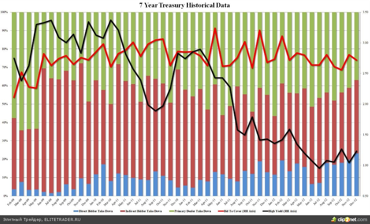 Доходность 7-летних облигаций американского Казначейства существенно выросла по итогам сегодняшнего аукциона, отражая рост аппетита к риску крупных инвесторов, несмотря на продолжающееся отсутствие консенсуса между американскими законодателями относительно мер предотвращения фискального обрыва.