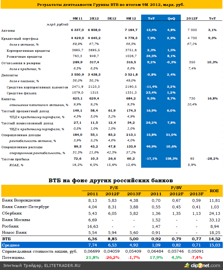 ВТБ торгуется дешевле Сбербанка и немного выше других российских банков по P/BV, и хуже по Р/Е из-за нашего консервативного взгляда на прибыль банка, который пока подтверждается. Падение прибыли беспокоит нас, так как снижение рентабельности активов усложняет увеличение достаточности капитала для банка. Мы скептически относимся к прогнозам руководства по прибыли на текущий год в районе 100 млрд. рублей, так как это потребует прибыли в 4К12 на уровне 40 млрд., то есть еще в полтора раза выше, чем в 3К12, но источников для получения такой прибыли, кроме резерва, у банка мы не видим.