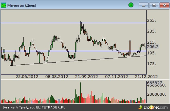 Консолидация на линии спроса летнего восходящего тренда завершилась заметным ростом котировок. Протестировав горизонтальный уровень предложения, которым выступает зона 214-215 рублей, цены начали откат вниз. Таким образом, развивается нормальное восходящее движение с отработкой локальных уровней. В настоящее время ближайшая локальная поддержка, способная остановить коррекцию к прошедшему росту, располагается вблизи отметки 200 рублей. Возможно после ее тестирования котировки возобновят движение на север.