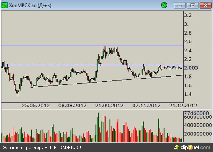 Цены продолжают консолидироваться под уровнем локального сопротивления - отметкой 2.05 рублей. Фактор удержания покупателями достигнутых высот несмотря на значимый уровень при слабости широкого рынка в последние дни, в перспективе может способствовать пробою текущего уровня предложения. С технической точки зрения это обстоятельство откроет ценам дорогу в район отметки 2.50. Слабость покупателей приведет к снижению котировок в район линии спроса локального восходящего тренда.