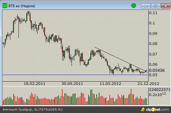 На недельном графике котировки вышли за пределы диагонального уровня сопротивления. Такой скромный пробой убедительным назвать нельзя. Однако учитывая, как обороняли отметку 0.050 рублей покупатели, потенциально это может стать плацдармом для очередного витка роста цен в район отметки 0.060 с возможностью ее преодоления . При развитии коррекции поддержка ценам будет оказываться на уровнях 0.0530-0.0525 рублей.