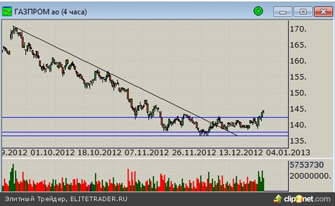 Акции газового гиганта последнее время смотрятся лучше широкого рынка, начиная наверстывать отставание от основных "голубых фишек". После пробоя нисходящего тренда и продолжительной консолидации, котировки постепенно начали двигаться наверх. При этом покупателям удалось закрепить цены над ближайшим локальным уровнем сопротивления, которым выступала отметка 143 рубля. Таким образом, есть технические основания ожидать дальнейшего роста цен с хорошим потенциалом движения в среднесрочной перспективе.